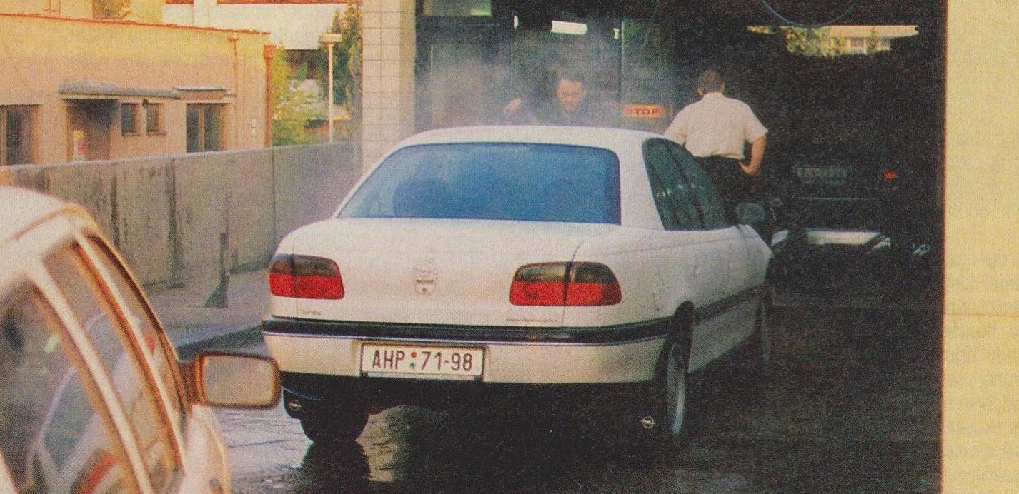 Zde fotografie z roku 1998. OPEL OMEGA B (registrován v Praze) v procesu předmytí v samoobslužné myčce čerpací stanice ESSO v Bratislavě.