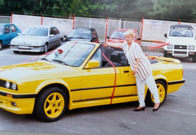 Původně červené BMW E30 320i cabrio nechal odstrojit a přelakovat do zářivě žluté barvy. Celý vzhled doplňovala dobová kola BORBET design C.