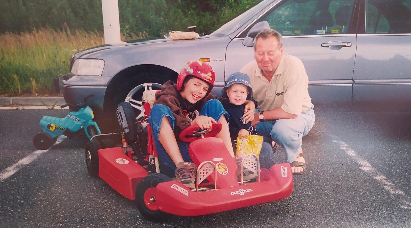 „Na fotce jsem já, můj starší bratr a náš děda. V pozadí je tátova HONDA LEGEND z roku 1996/7 (neví přesně) 3.5l 6 válec. Motokáru postavil děda. Koupený byl jenom motor a plastové lemy, zbytek je domácí výroba. Motokára v rodině jezdí dodnes, kde je Legend, to už nevíme. Fotografie samotná je z roku 2003.“