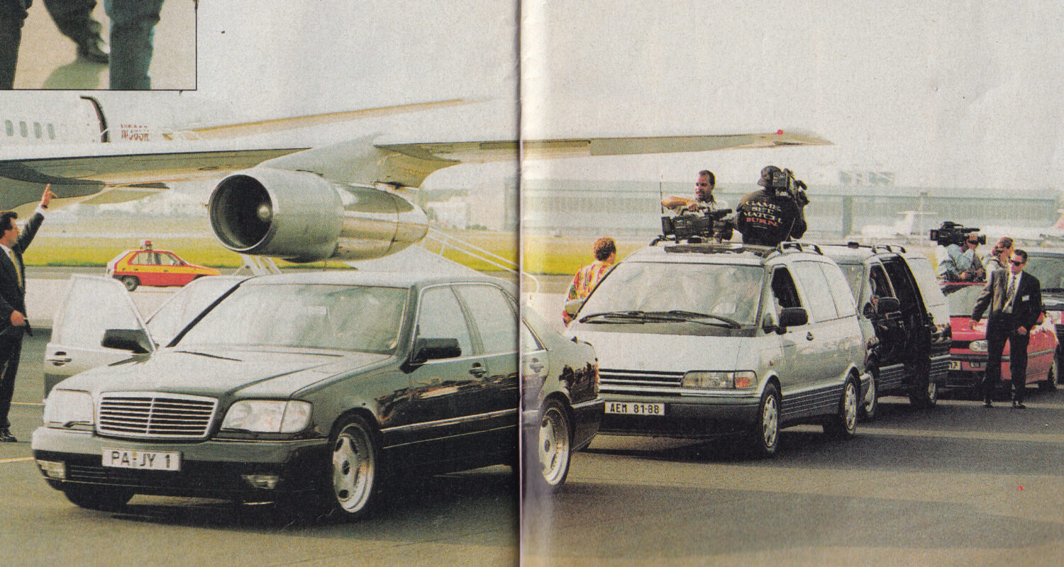 Je úterý, 3. září roku 1996 a v Pražské Ruzyni přistává BOEING 707 Michaela Jacksona. Nyní je již známa celá automobilová sestava, zajišťující Michaelův transport. V čele kolony se pohybuje nejvýkonnější vůz – JAGUAR XJR 4.0 SUPER CHARGED, ten má jako jediný ze všech manuální převodovku. Jackson si zvolil pro svůj transport speciální TOYOTU PREVII, která byla jednak pancéřovaná, jednak měla unikátní sound system SONY s neskutečným výkonem a reprodukcí. Vůz byl dopraven z Velké Británie. V koloně se objevují i vyžadované vozy MERCEDES-BENZ třídy S.