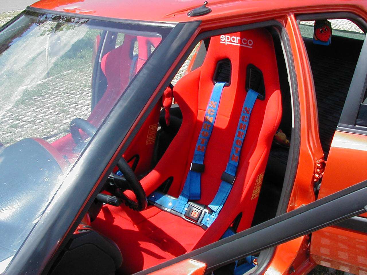 Interiér vozu – sedačky Sparco a čtyřbodové pásy Schroth.