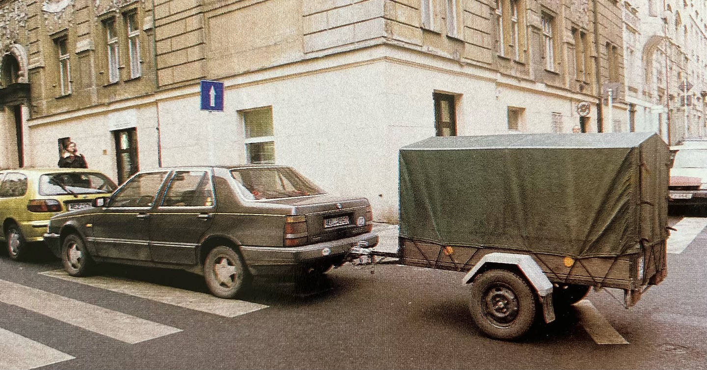 Tak takový pohled dnes v pražských ulicích jen tak neuvidíte. LANCIA THEMA s vozíkem, nevhodně zaparkovaná na přechodu.