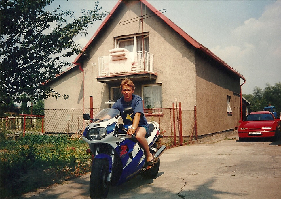 Martin Klein (@modenamartin) a jeho ?⚪SUZUKI GSX-R1100 v roce ’93. GSX-R1100 se vyrábělo od roku 1986 do roku 1998. Maximální rychlost 262 km/h, 155 koní (116 kW), to byl fičák! V pozadí ?OPEL CALIBRA 2.0 16V. Mimochodem Martin dodnes vlastní GSX-R, ale model 750.
