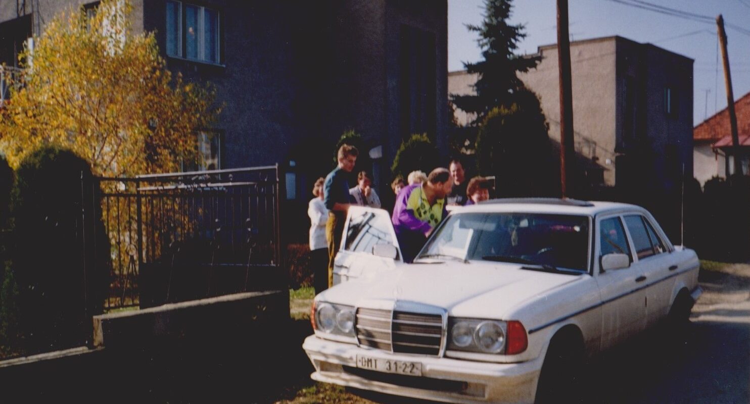„Dcéra babkinej sestry sa v roku 1987 vydala do Čiech, do Prostějova. Jej manžel bol vojenský pilot (ktorý bohužiaľ tragicky zahynul pri leteckej nehode v roku 1992) a na fotografii je auto jeho brata Miloša, ktorý k nám do Raslavíc prišiel začiatkom 90. rokov na návštevu. Bol v 90. rokoch podnikateľ a vášnivý modelár lietadielok. Mal v Brne firmu ešte s dvoma spoločníkmi na výrobu antialergickych prikrývok a paplónov. A vraj sa mu vtedy po revolúcii darilo. Auto bolo registrované v okrese Brno-mesto a po tomto Mercedese si kúpil nový Renault Mégane prvej generácie v zelenej farbe. V tej dobe mať také auto muselo byť niečo. Obzvlášť tesne po revolúcii…“