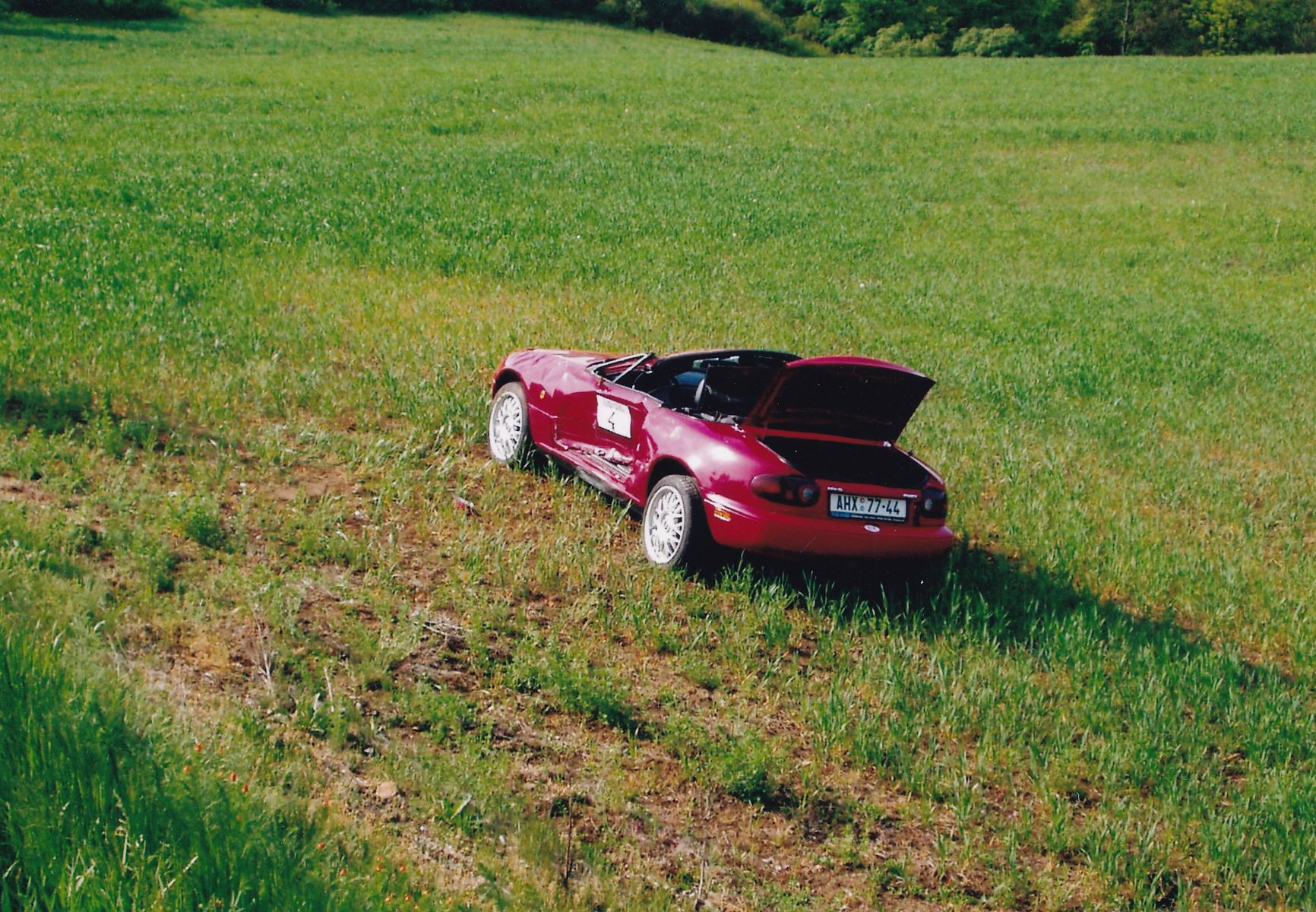 To ale není vše… Na srazu vyletěla z cesty další, červená MX-5 se startovním číslem 4.