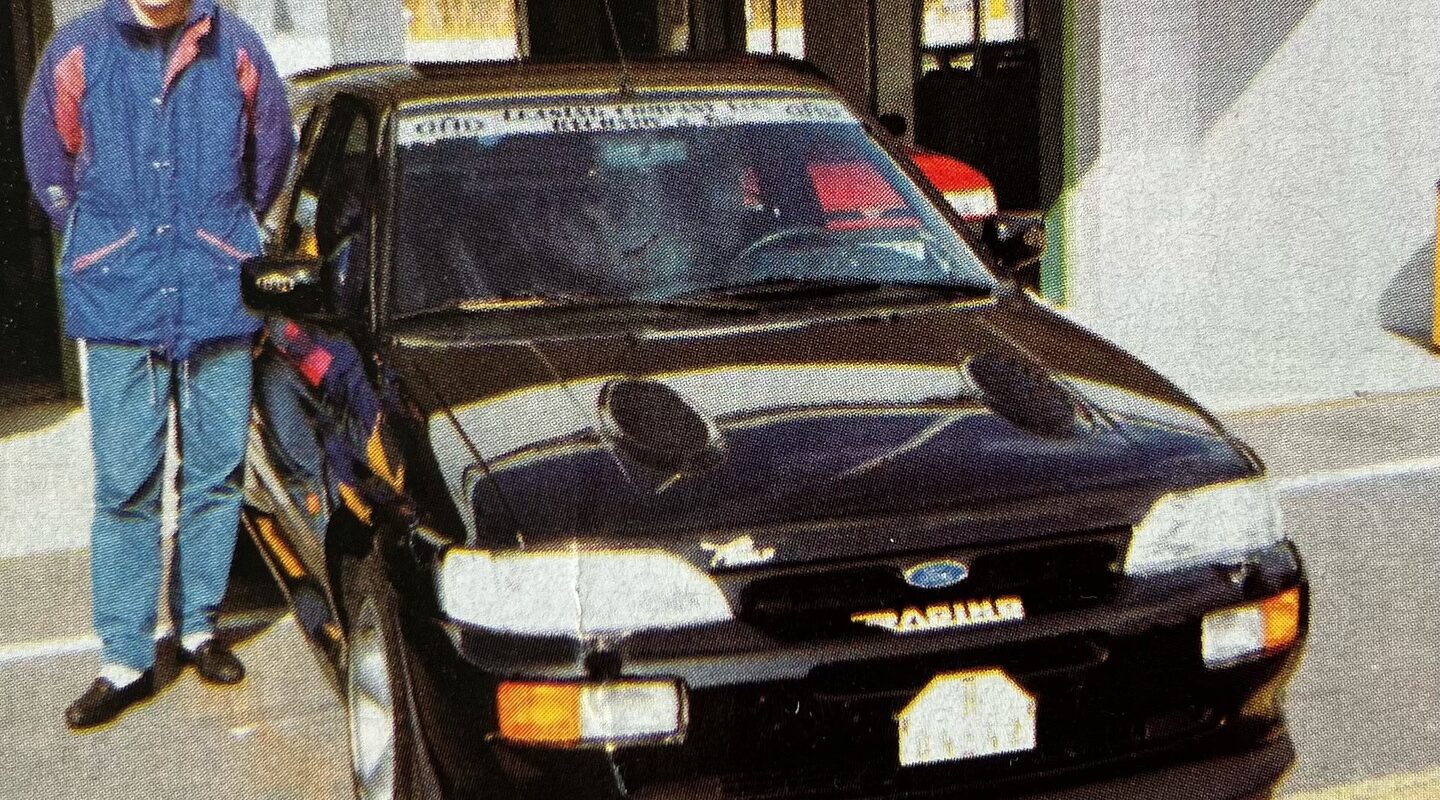 Automobilový závodník Josef Kopecký vedle ikonického FORDu ESCORT RS COSWORTH, kterého měl k dispozici od sponzorů (leasingová společnost B+B a FORD RAŠINO KUŘIM), rok 1993.